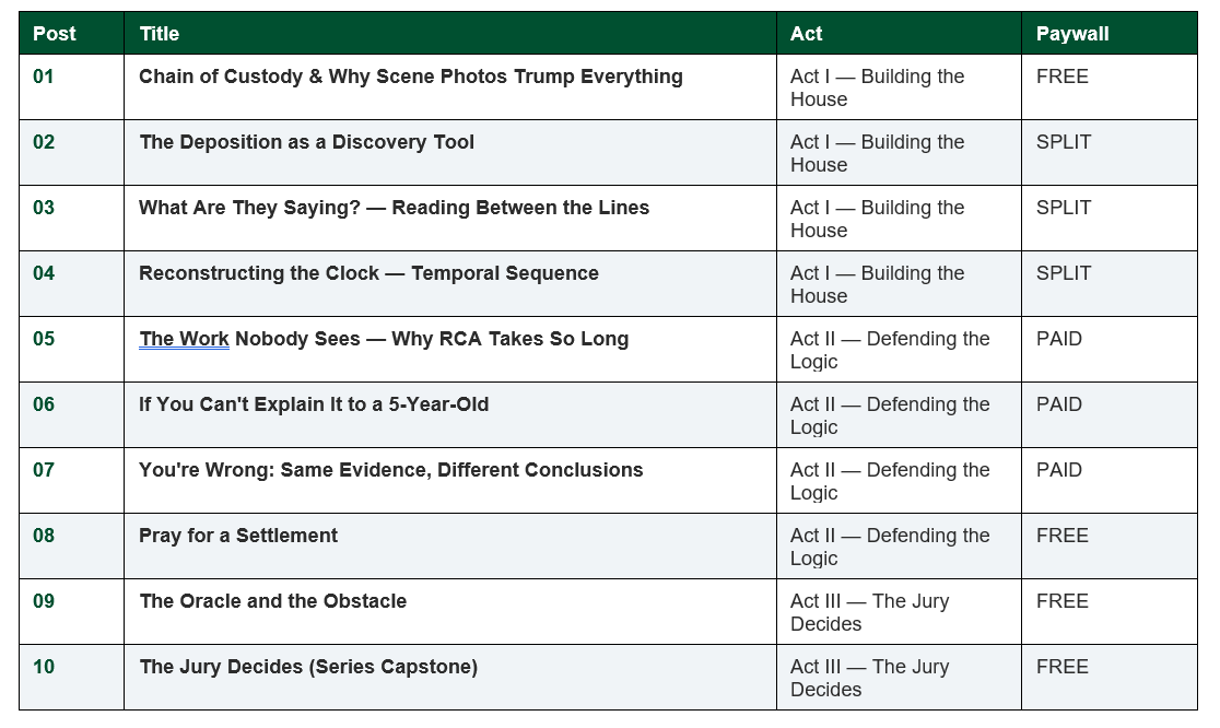 The foundation of every forensic engagement is physical evidence, collected and preserved with chain of custody discipline. Act I follows the engineer through scene documentation, deposition transcript analysis, expert intelligence gathering, and timeline reconstruction. Every post in this act produces a fact — a brick in the house.