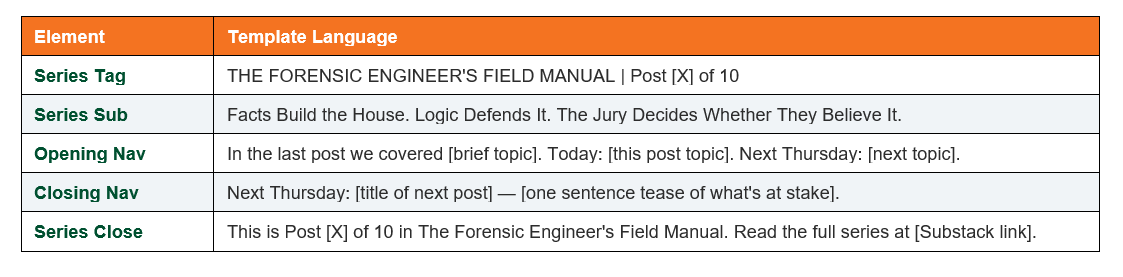 Every post requires a contrast (a large outcome traced to a small overlooked detail) and a confession (a moment where the engineer or the system got it wrong and paid for it). Pure analysis without a human moment does not hold a courtroom audience. The ‘in most cases’ deposition story in Post 8 is the model.